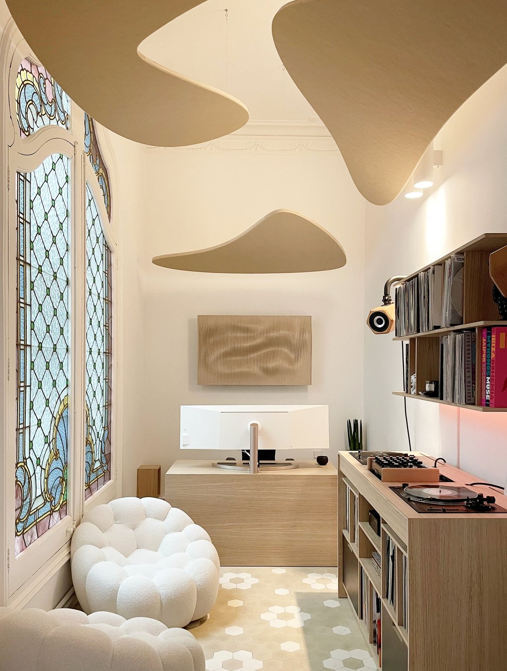 A high ceiling studio in the Eixample furnished with precise acoustic elements and custom furniture. Suspended clouds, a carved wooden wave and a compact DJ booth shape a warm, controlled and fully functional workspace.