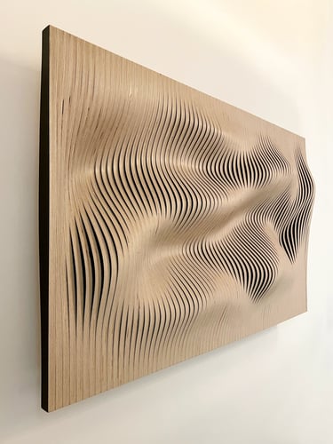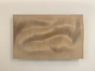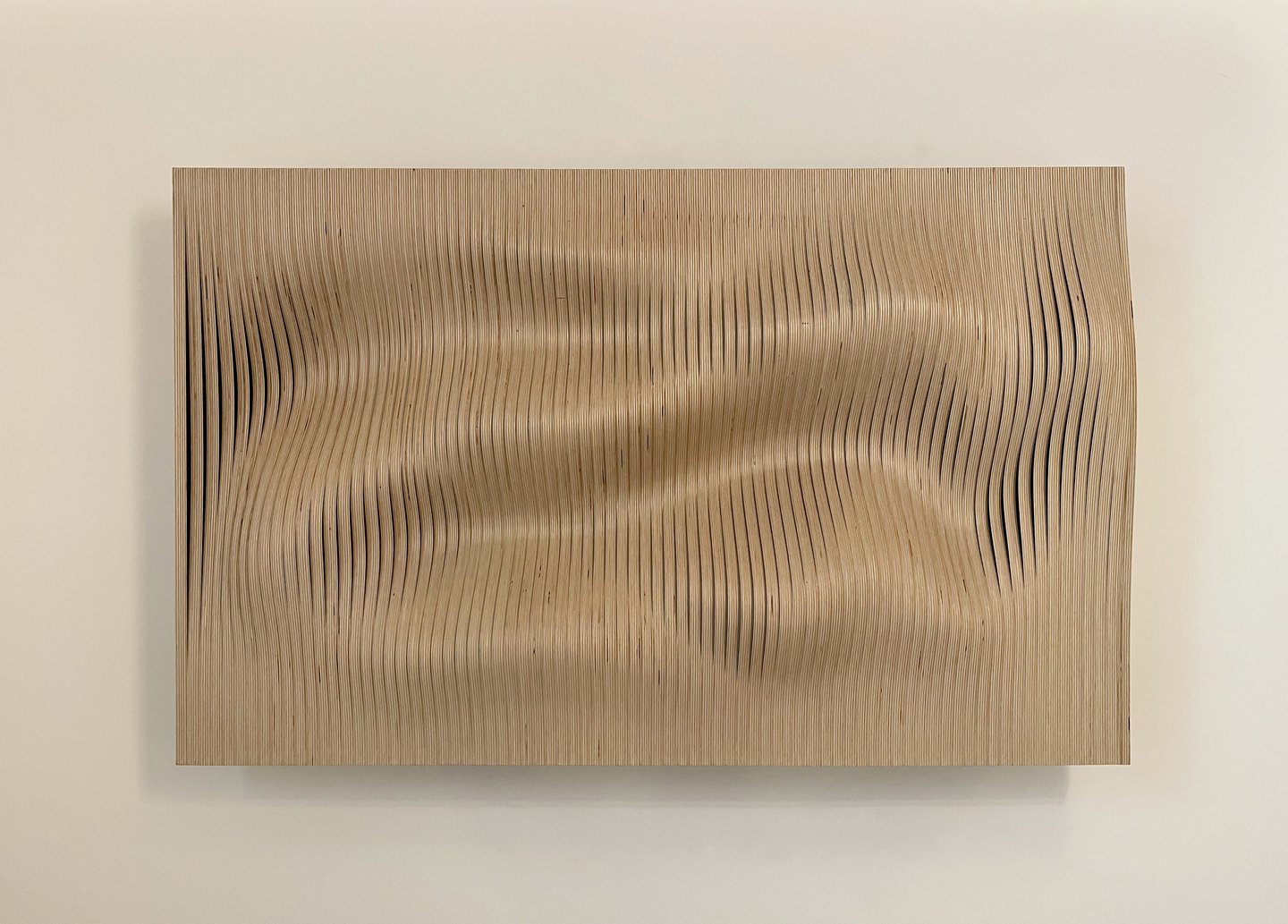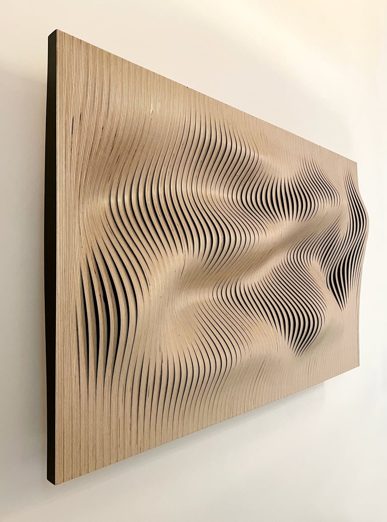 Floating off the wall with hand-finished edges, the sculpted wave acts as the project’s final element, bringing the intervention together through its controlled depth and continuous form.