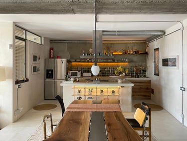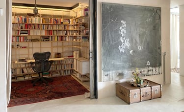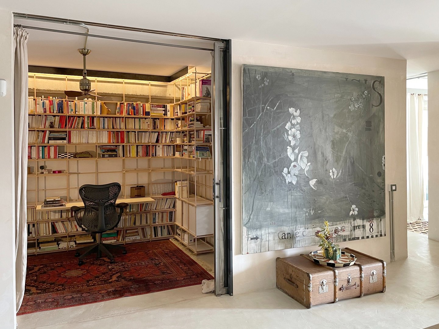 The structure appears in the living room, dining area, study and around columns, always the same logic, shifting in scale to fit each space.