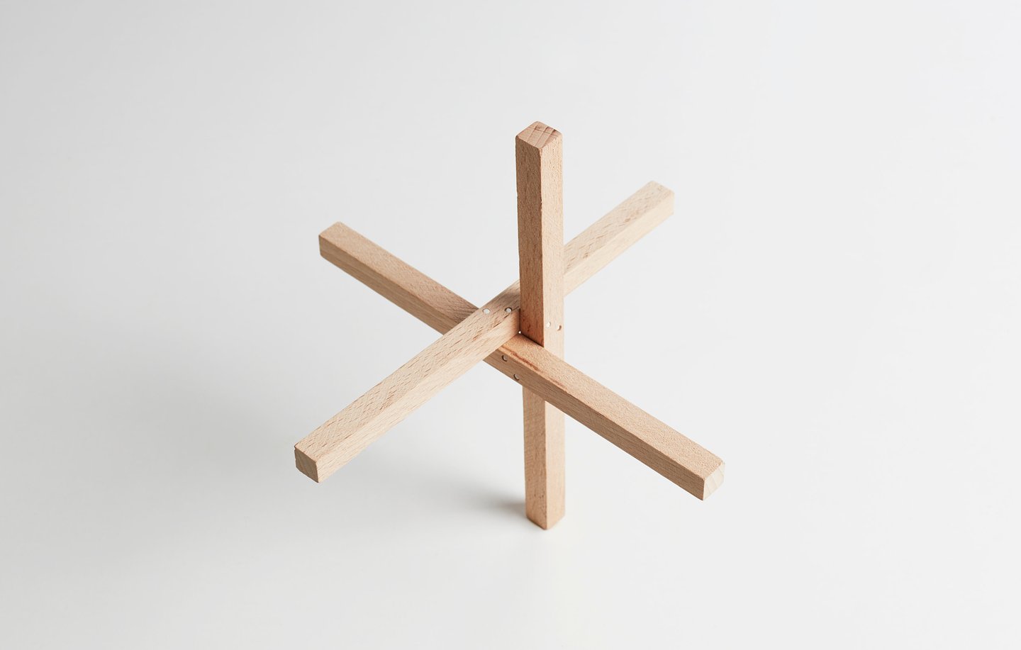 Each joint is built from 12×12 mm beech sticks crossed by 3 mm fiberglass pins. No glue, only precision-drilled holes and friction fit geometry.
