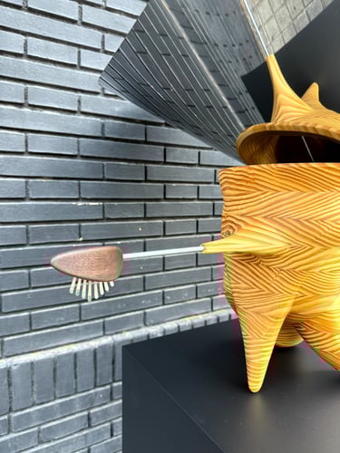 TECHNIQUE: Machined and carved wood. Polished and bent stainless steel.