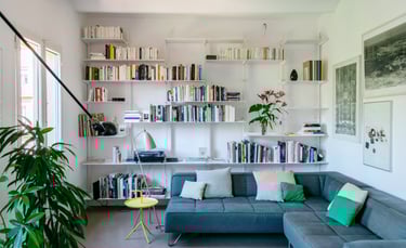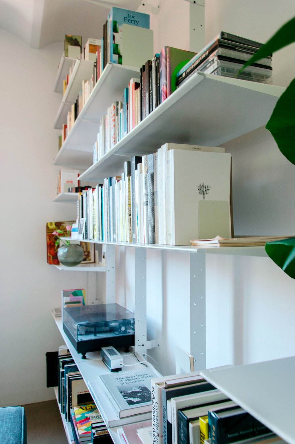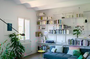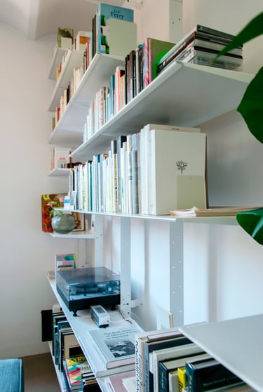A laser cut, folded steel shelving system that defines the room with a clean structural rhythm. Lightweight, precise and completely open, it organizes books and objects while keeping the space clear and quiet.