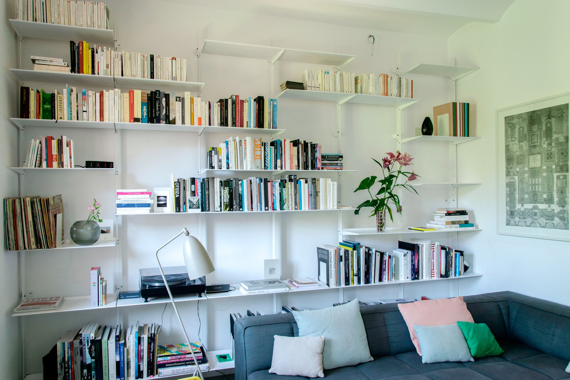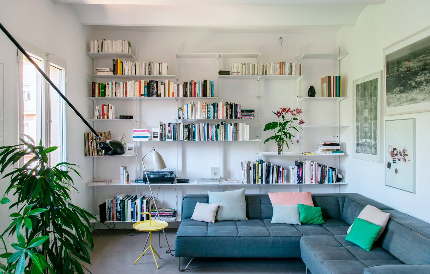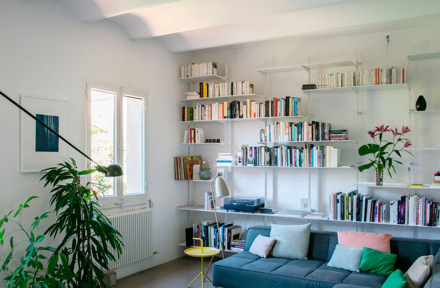 The system spans living, reading and work areas, adjusting in length and height while keeping a single structural logic.