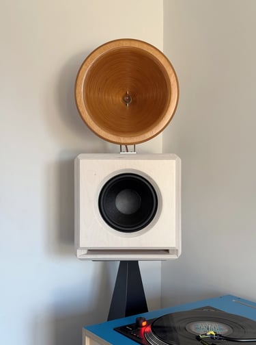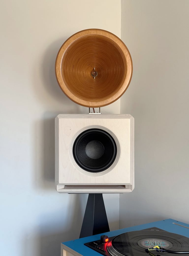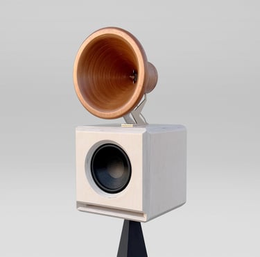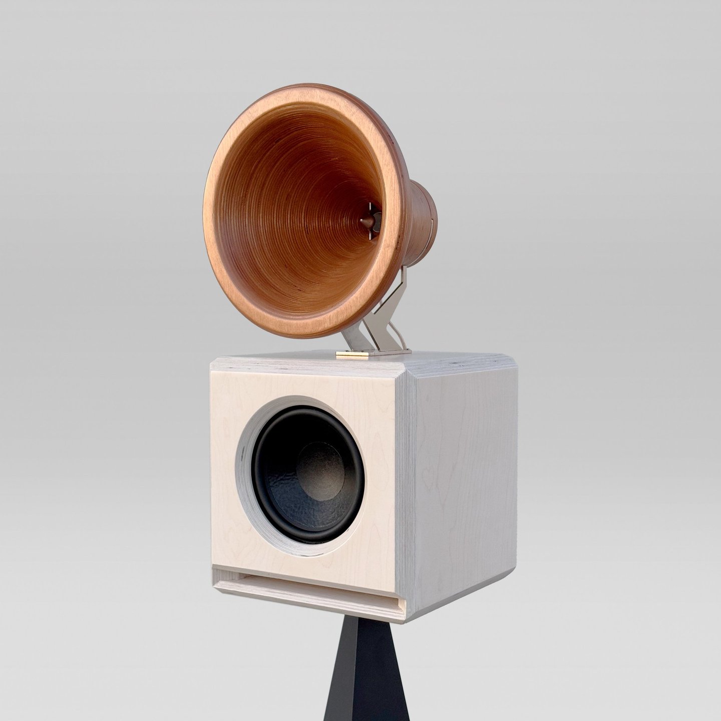 KONO unites a solid wooden cube for controlled low frequencies with a carved cone for clean highs, both held by stainless steel elements that stabilise and guide dispersion. Its form is the result of each part doing exactly what its range demands.