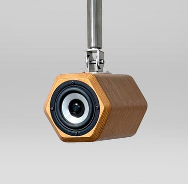 HEX uses a rigid, multi-sided wooden shell that controls reflections and projects sound with focus, supported by a mounting system that lets the piece be oriented with precision. A compact form designed for clear, directed sound.