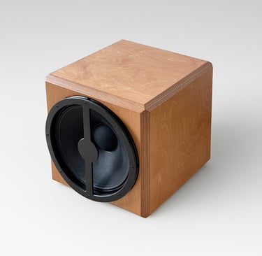 SUB is a sealed solid wood cube built to contain low frequency energy with control and stability. Chamfered edges ease internal pressure, while a lacquered steel guard protects the driver without interrupting the clarity of the form.