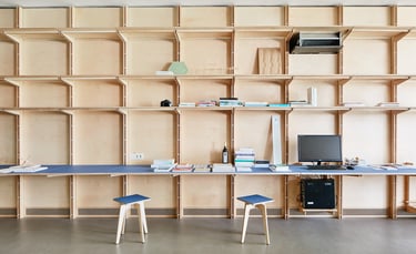 The project is built around a modular plywood framework digitally fabricated, hand-assembled—capable of adapting to work, display, or storage while keeping the space open and usable.